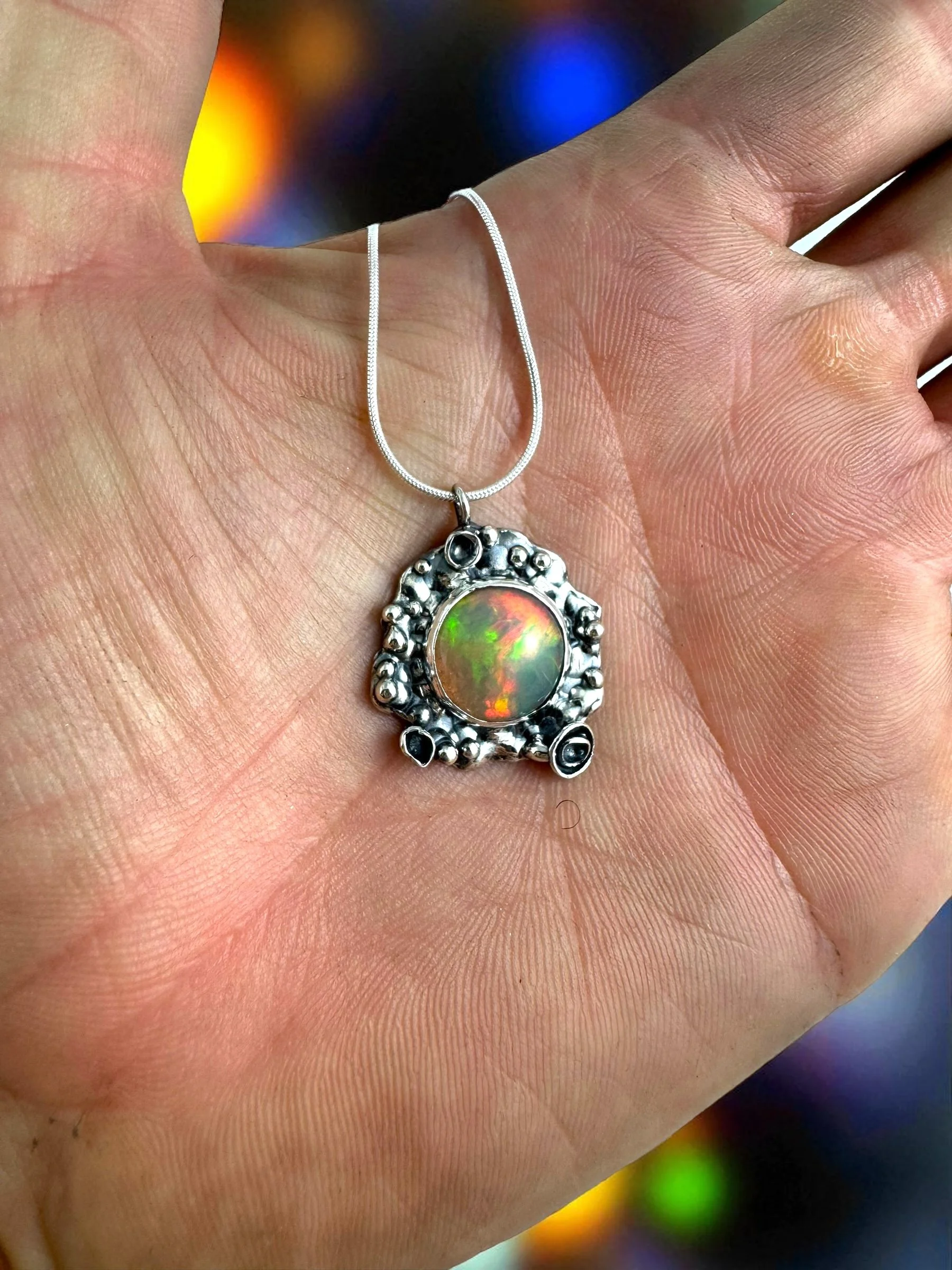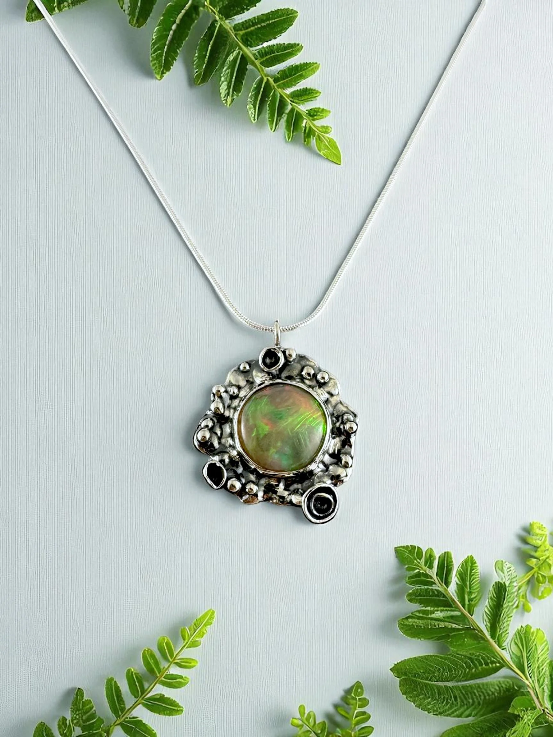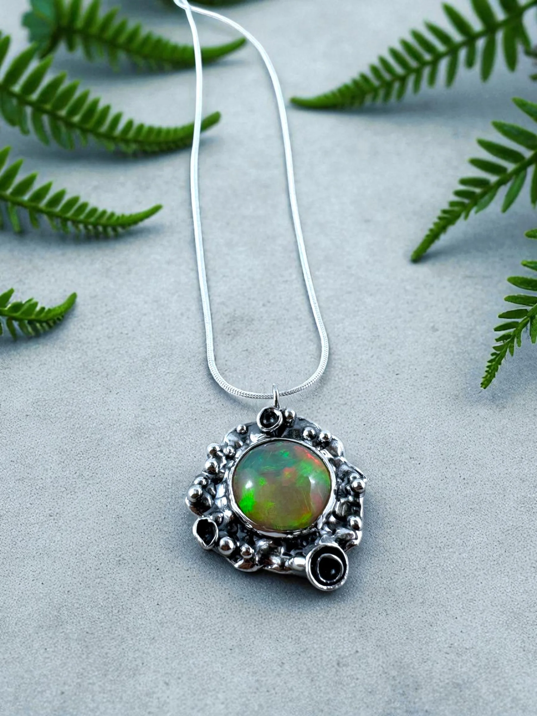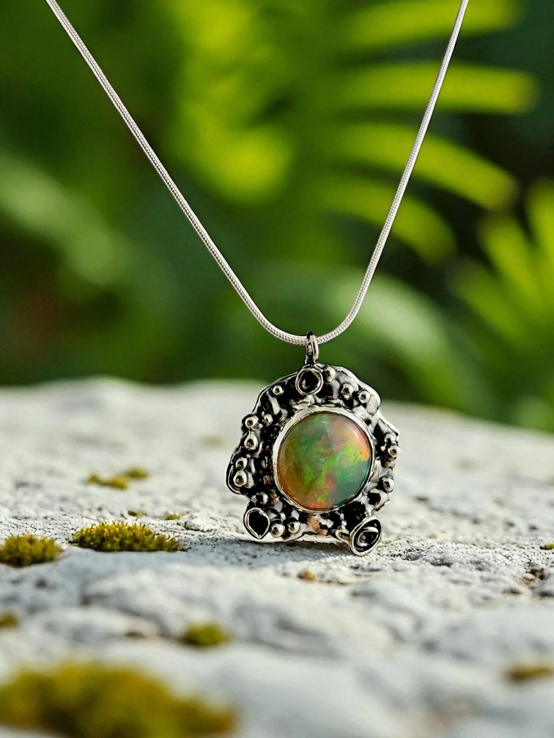 Like a secret garden captured in silver, this necklace holds a fiery Ethiopian Welo opal at its heart—its colors flashing with green, gold, and ember-red as if lit from within. The organic, textured silver setting takes inspiration from lichen: wild, intricate, and alive with detail. No two curves are alike, making it as untamed and unique as nature itself.