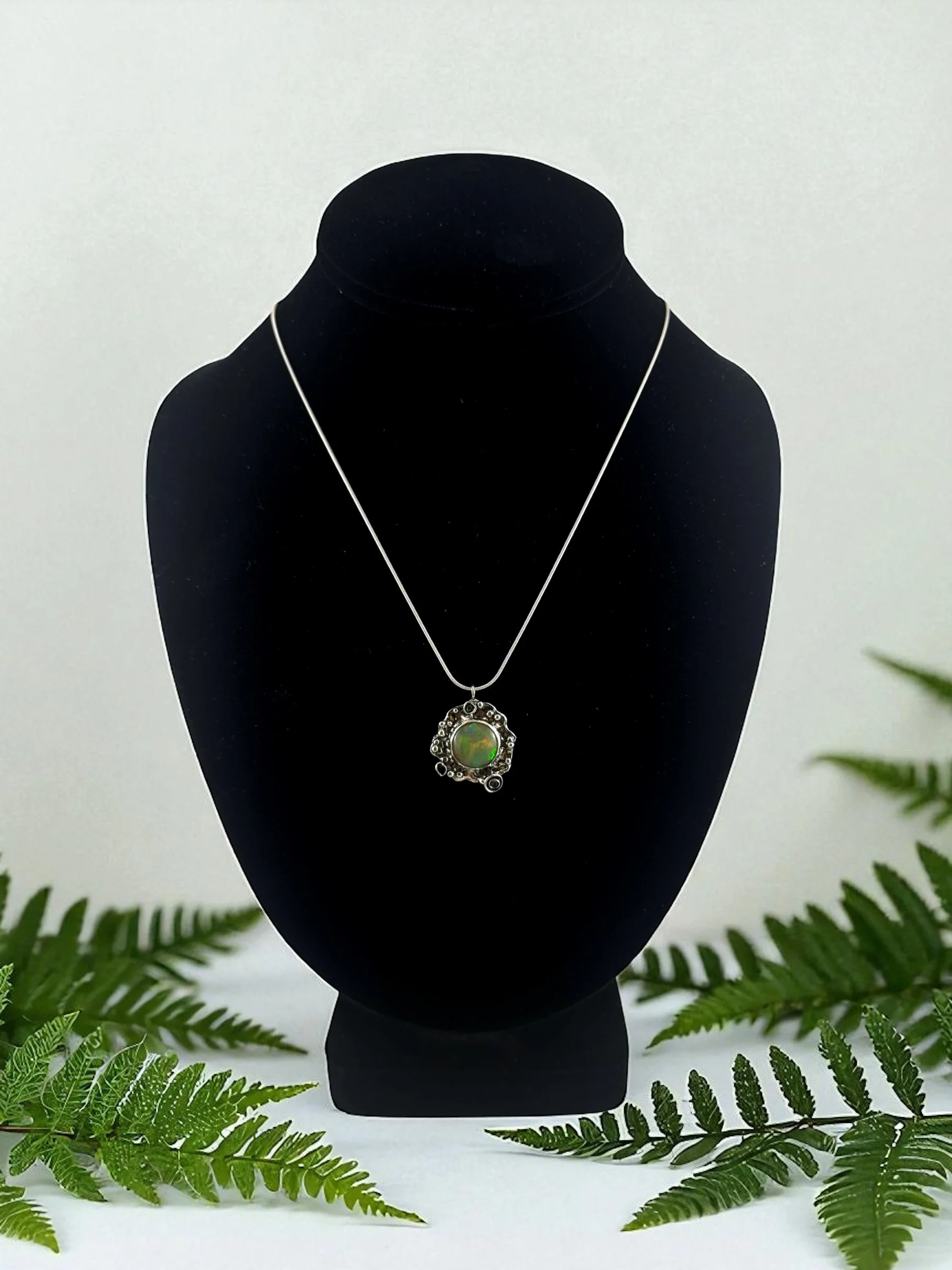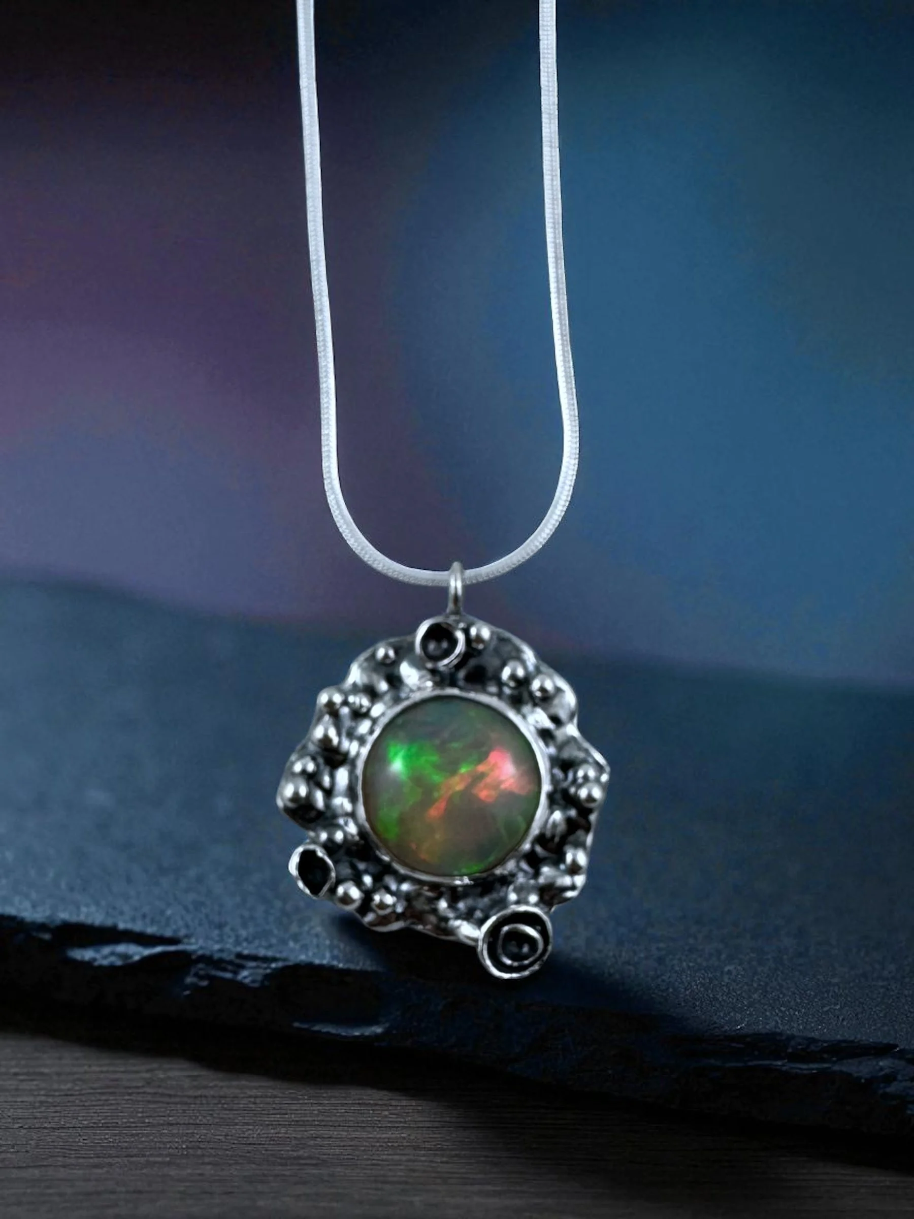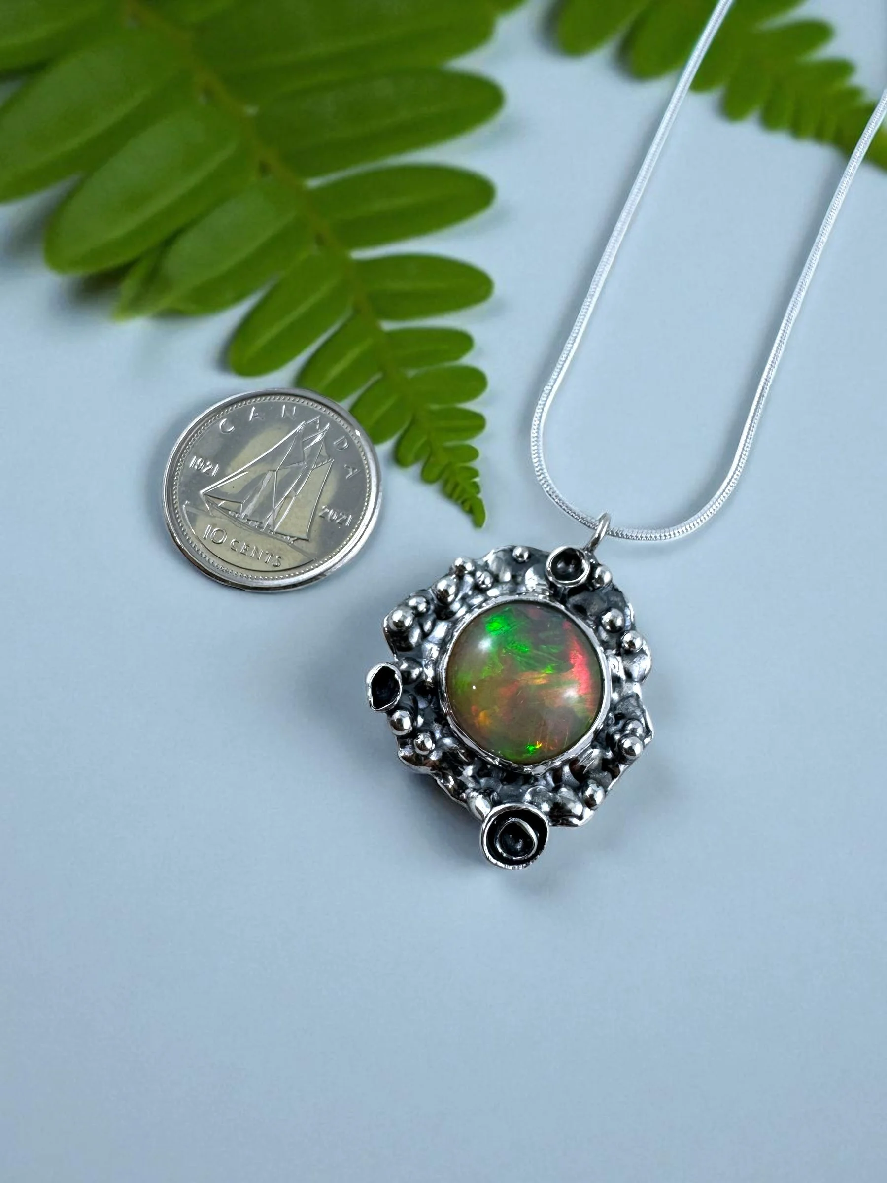 Like a secret garden captured in silver, this necklace holds a fiery Ethiopian Welo opal at its heart—its colors flashing with green, gold, and ember-red as if lit from within. The organic, textured silver setting takes inspiration from lichen: wild, intricate, and alive with detail. No two curves are alike, making it as untamed and unique as nature itself.