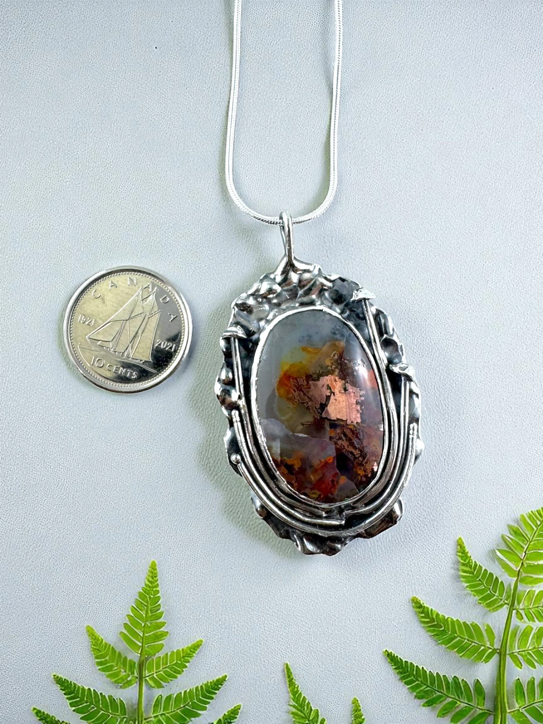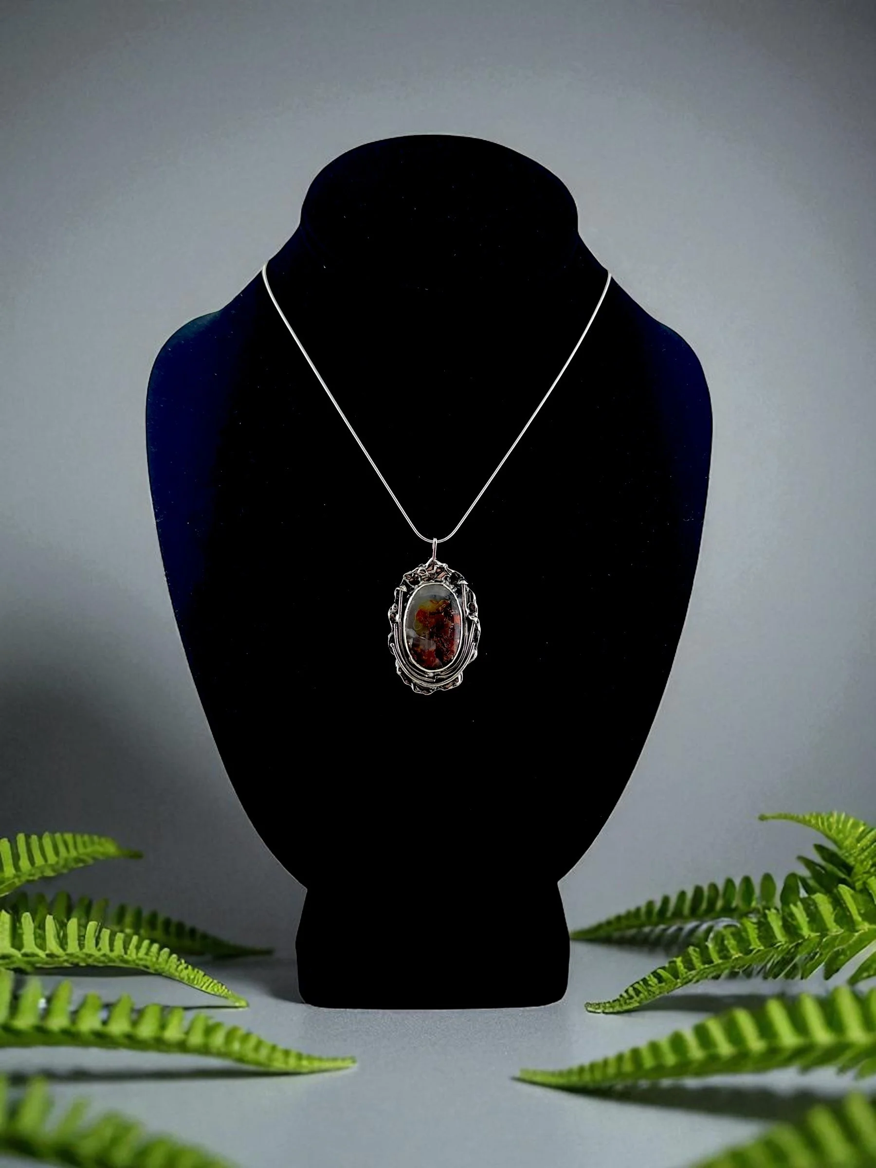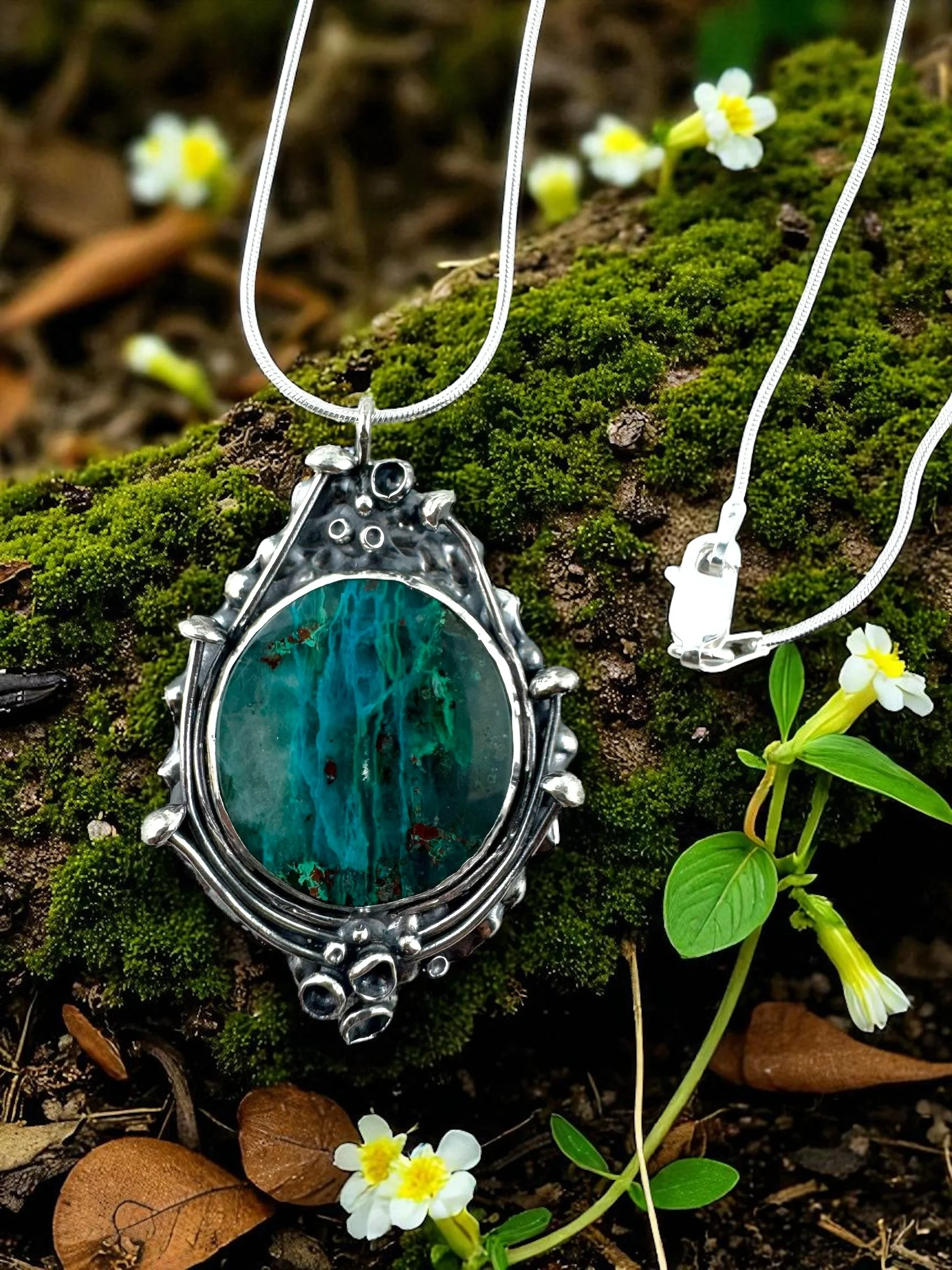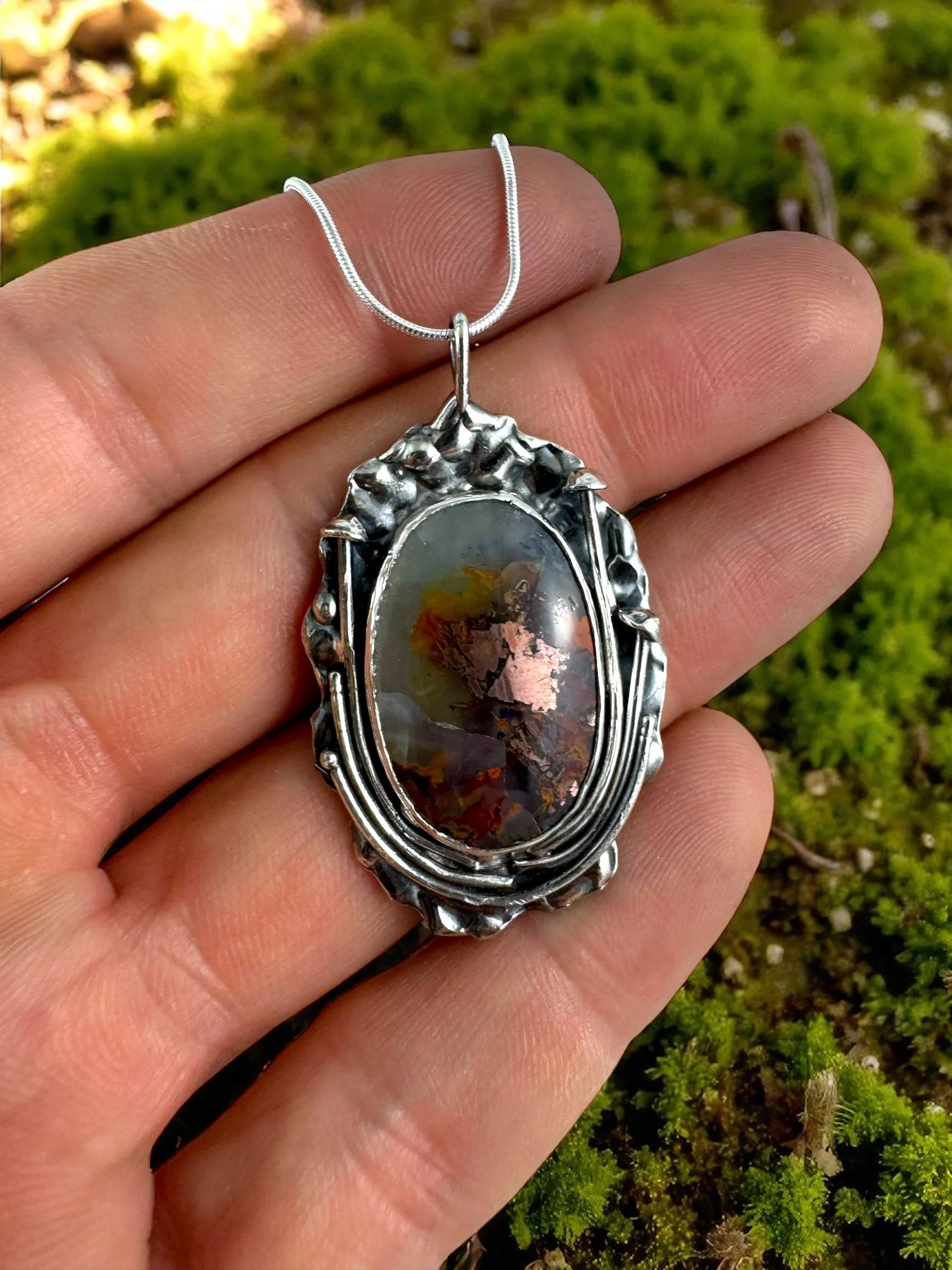 Like a secret garden captured in silver, this necklace holds a fiery Ethiopian Welo opal at its heart—its colors flashing with green, gold, and ember-red as if lit from within. The organic, textured silver setting takes inspiration from lichen: wild, intricate, and alive with detail. No two curves are alike, making it as untamed and unique as nature itself.