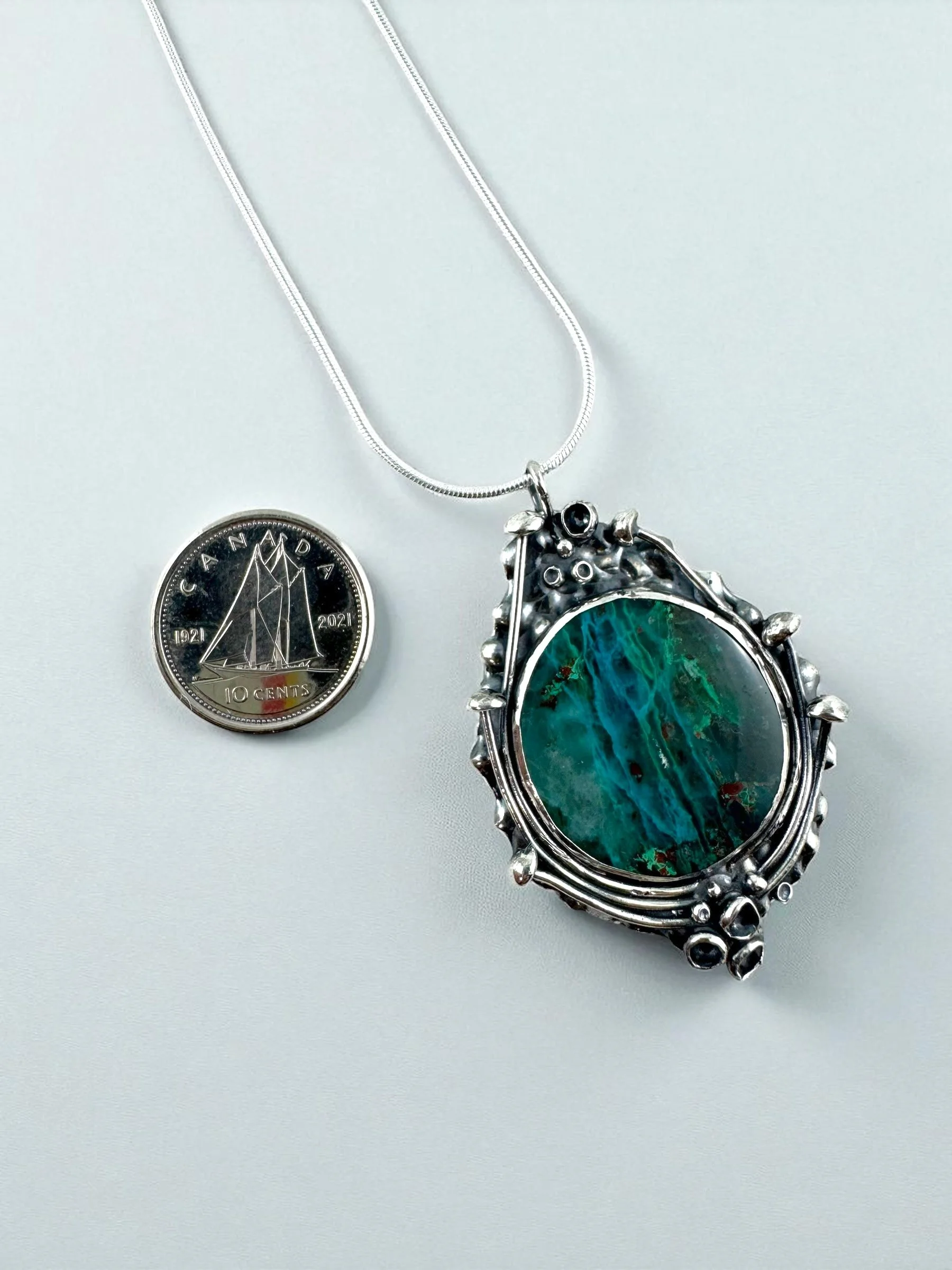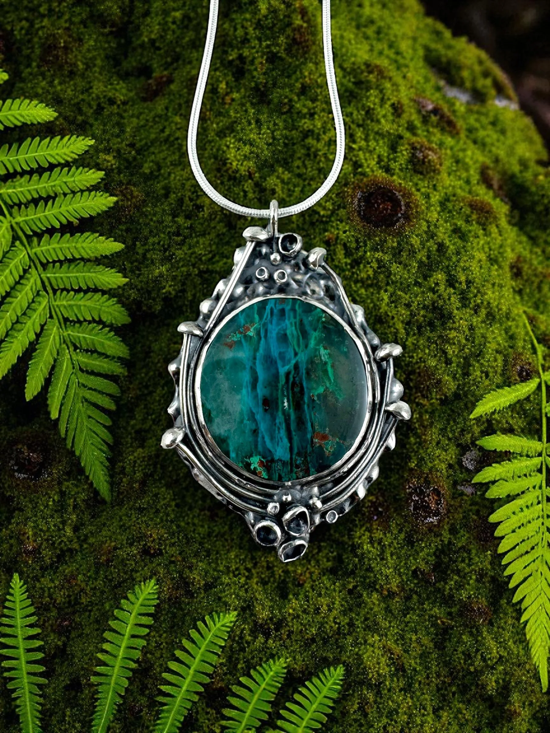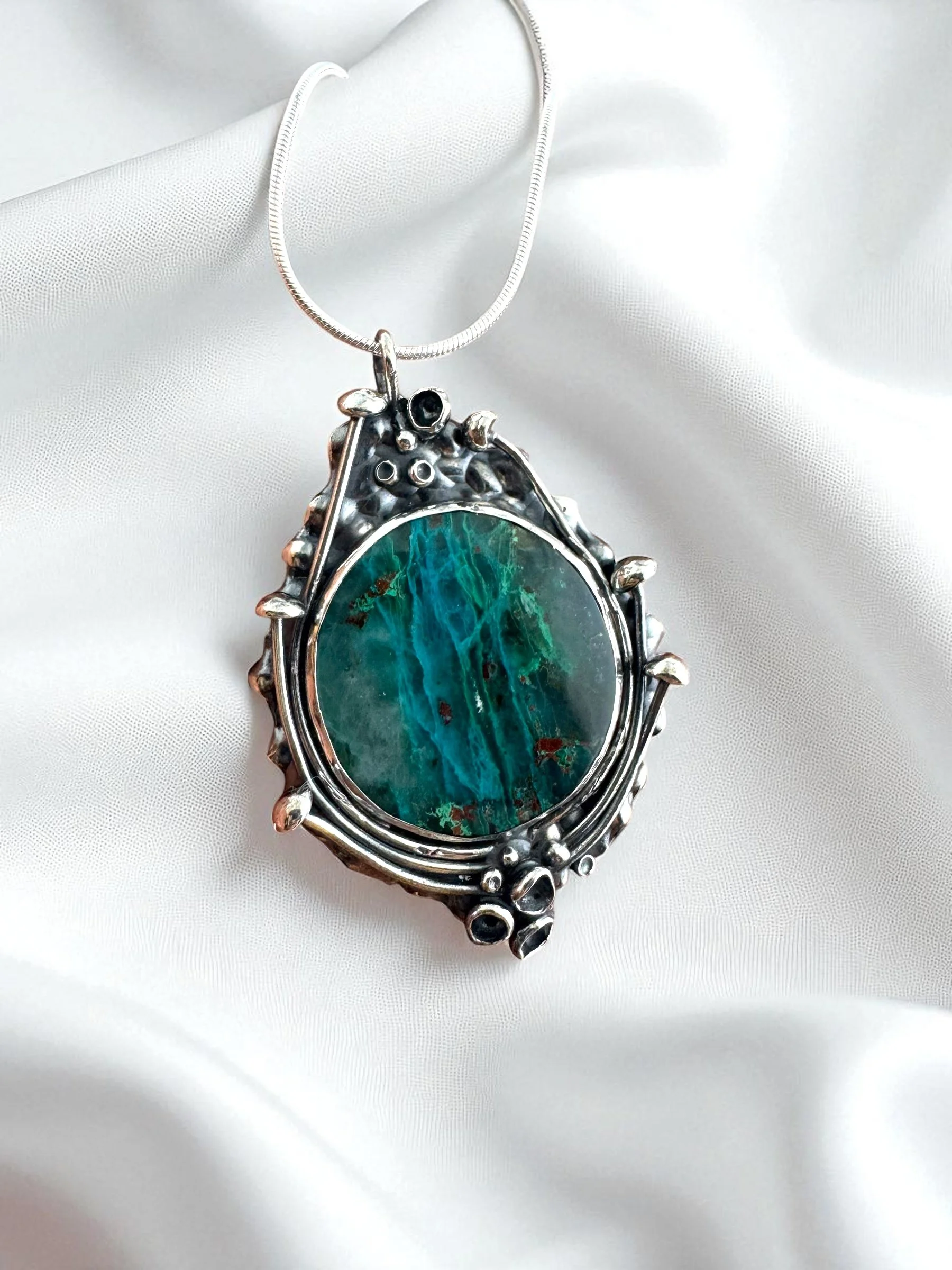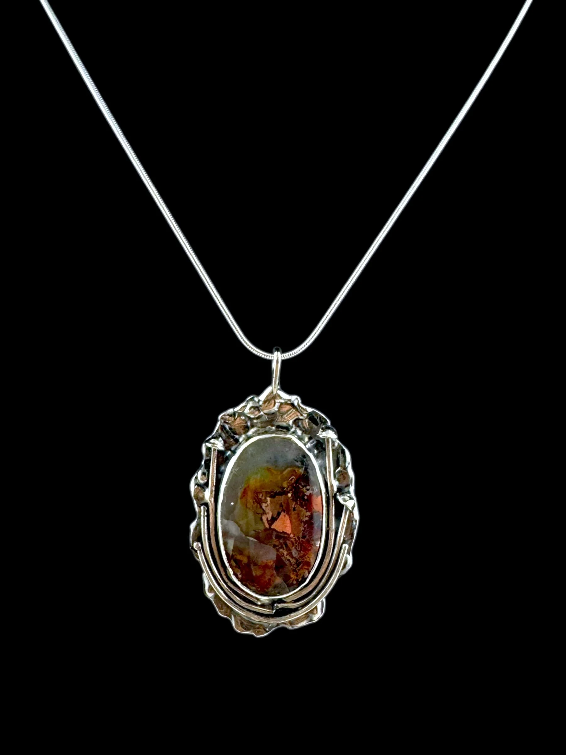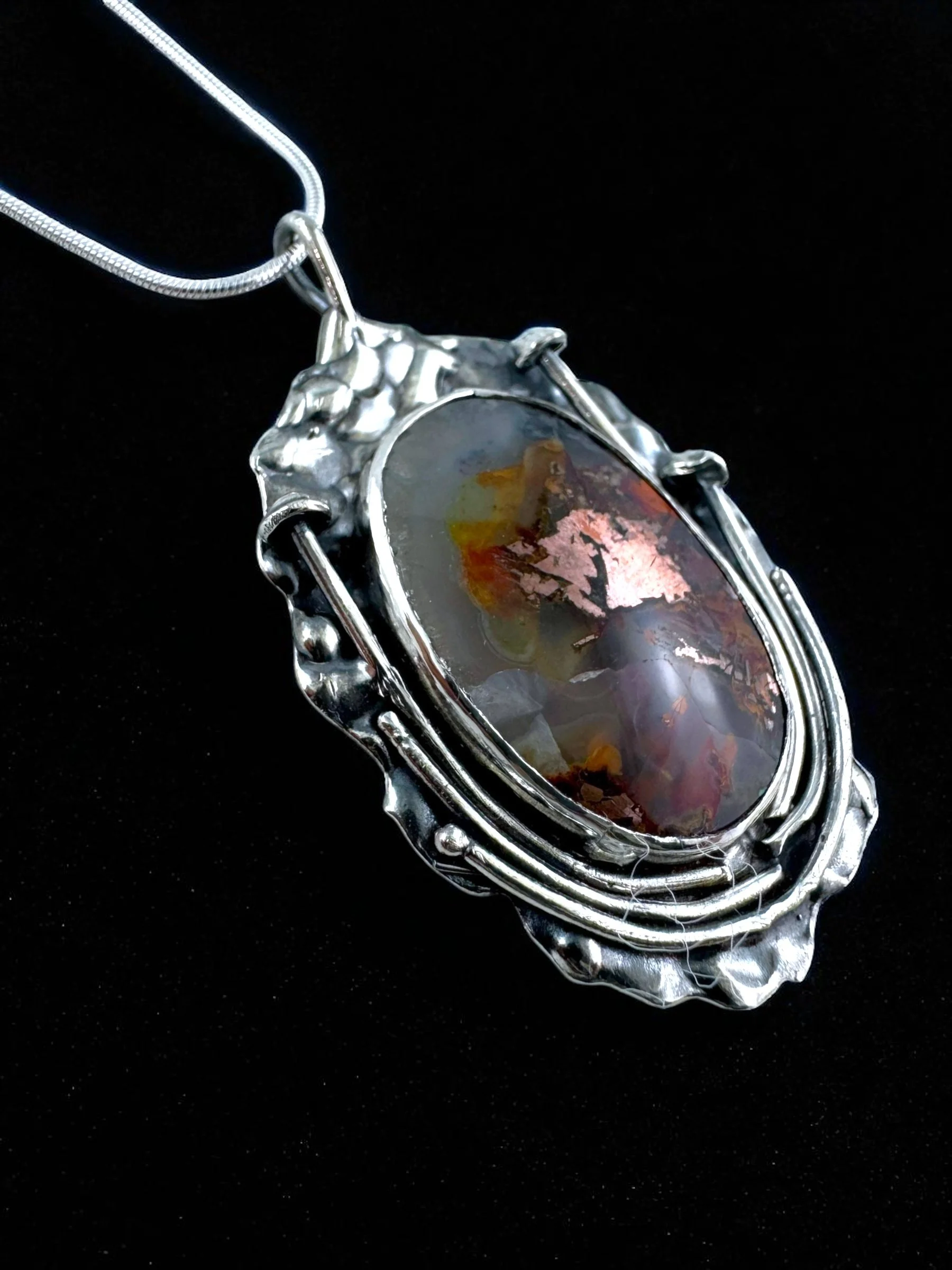 Suspended on an 18" silver snake chain, this pendant is a little universe of shimmer and shadow, ready to rest close to yours.